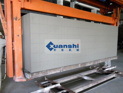 1、將澆注養(yǎng)護后的坯體帶?蚝蛡(cè)板凌空吊起,翻轉(zhuǎn)90度(坯體已直立),吊放至切割臺進行開模、脫模。吊去模框,坯體即能切割。