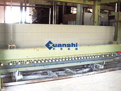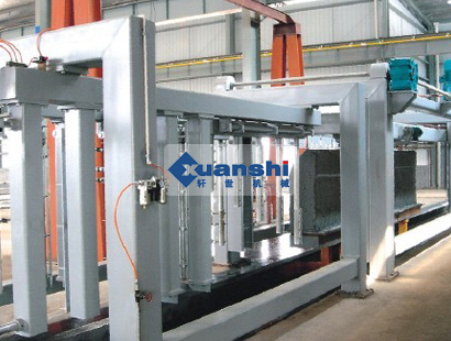 (2)坯體行走:預(yù)養(yǎng)好的坯體帶?罩蟹D(zhuǎn)90度,然后將坯體放在切割小車(chē)上或輥道上,由脫模機(jī)構(gòu)脫去?。坯體通過(guò)小車(chē)或輥道行走進(jìn)行水平切割,切割好后坯體繼續(xù)前行至橫切位置定位,進(jìn)行橫向切割,切割好后前行由行車(chē)吊走坯體。