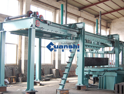 模具內(nèi)預(yù)養(yǎng)好的坯體,由定點行車將加氣混凝土坯體吊到翻轉(zhuǎn)臺上,脫掉?,操作控制系統(tǒng), 指令液壓機構(gòu)將翻轉(zhuǎn)臺翻轉(zhuǎn)90°,由縱向水平切割機構(gòu)行走完成切割動作,再由橫切機構(gòu)自上而下擺切割動作完成上升到原位完成一次切割周期。