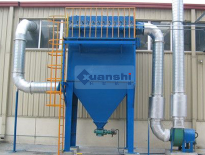 當含塵氣體由進風口進入除塵器沉降室,首先碰到進風口隔板,氣流便轉向流入灰斗,同時氣流速度放慢,由于慣性作用,使氣體中粗顆粒粉塵直接流入灰斗。起預 收塵的作用,進入灰斗的氣流隨后折而向上通過內部裝有金屬骨架的濾袋粉塵被捕集在濾袋的外表面,凈化后的氣體進入濾袋室上部清潔室,匯集到出風口排出,含 塵氣體通過濾袋凈化的過程中,隨著時間的增加而積附在濾袋上的粉塵越來越多,增加濾袋阻力,致使處理風量逐漸減少,為正常工作,要控制阻力在一定范圍內 (140--170毫米水柱),必須對濾袋進行清灰,清灰時由脈沖控制儀順序觸發(fā)各控制閥開啟脈沖閥,氣包內的壓縮空氣由噴吹管各孔經文氏管噴射到各相應 的濾袋內,濾袋瞬間急劇膨脹,使積附在濾袋表面的粉塵脫落,濾袋得到再生。清下粉塵落入灰斗,經排灰系統(tǒng)排出機體。由此使積附在濾袋上的粉塵周期地脈沖噴 吹清灰,使凈化氣體正常通過,保證除塵系統(tǒng)正常運行。